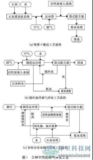 城市生活垃圾焚燒煙氣處理技術較多,一般通過活性炭吸附系統(tǒng)、除塵系統(tǒng)和煙氣脫酸工藝系統(tǒng)構成。城市生活垃圾焚燒煙氣凈化技術的核心是酸性氣體脫除技術。根據城市生活垃圾脫酸過程中的干濕形態(tài),可將酸性氣體脫除分為干法、半干法和濕法三種不同的凈化工藝。半干法酸性氣體脫除的凈化工藝具有凈化效率高、不生成廢水、投資低、流程簡單和運行費用低的特點。目前國內半干法城市垃圾焚燒煙氣凈化工藝主要有多組分有毒煙氣治理技術、循環(huán)懸浮煙氣凈化技術和噴霧干燥法煙氣凈化技術,三種不同工藝的流程圖見圖1。